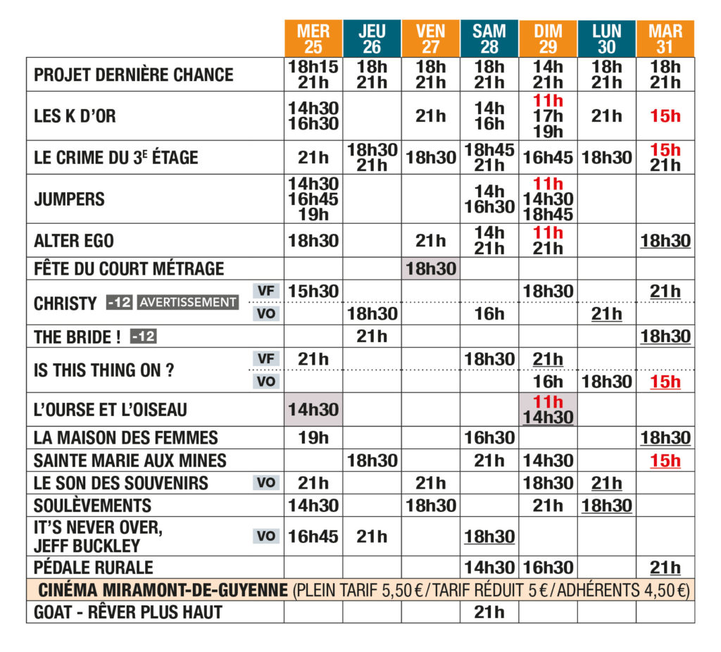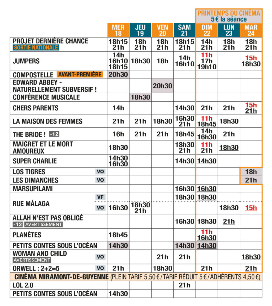 Bonjour, LE PROGRAMME du 18 au 31 mars 2026 est là (dans l’onglet PROGRAMMES PDF et Grilles Horaires ci-dessous).