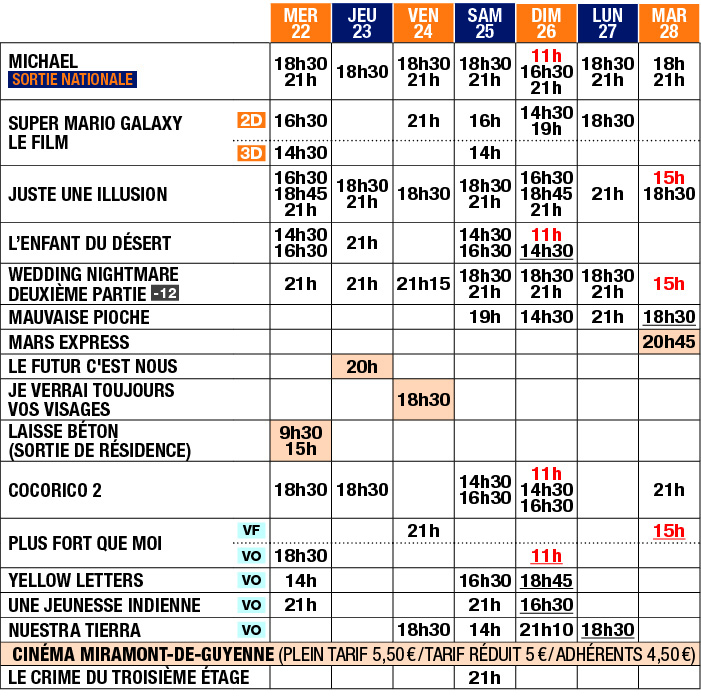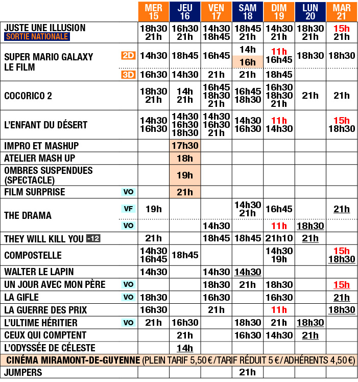 A LA UNE : Programme du 15 au 28 avril 2026 – Horaires séances – Programmation